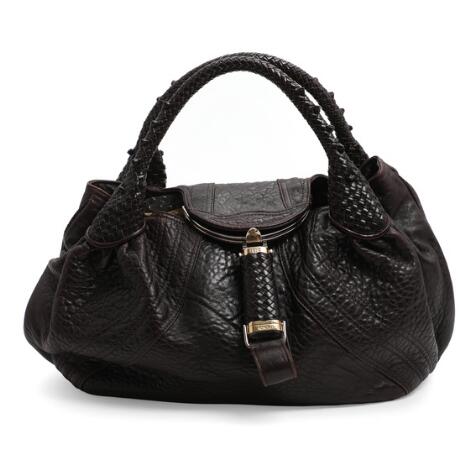2542/1277Fendi: "Spy" handbag of dark brown leather with gold tone hardware and two handles.