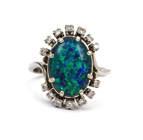 2542/1264Poul E. Boesen: An opal and diamond ring set with an opal triplet encircled by numerous diamonds, mounted in 14k white gold. Size 53.