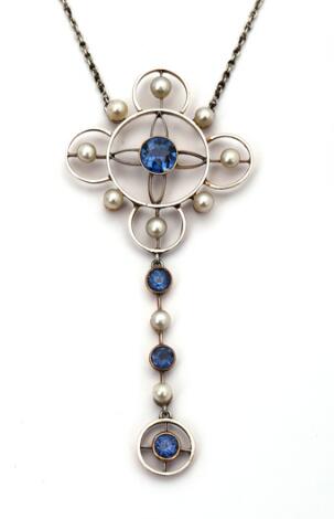 2542/1258A pendant set with synthetic sapphires and cultured pearls, mounted in 14k gold and platinum. Pendant app. 5.6 cm.L. app. 39 cm. Cirka 1880'es.