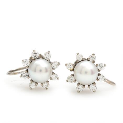 2542/1252A pair of pearl and diamond ear screws, each set with pearl and brilliant-cut diamonds, mounted in 14k white gold. Diam. 1.2 cm. (2)