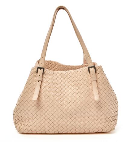 2542/1309Bottega Veneta: A "Cesta Tote" bag of light pink woven leather with dark hardware, two adjustable handles and one compartment.