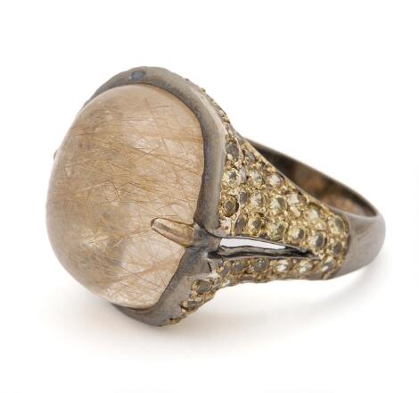 2542/1263A rutile quartz and sapphire ring set with a rutile quartz flanked by yellow sapphires, mounted in silver. Size 54.