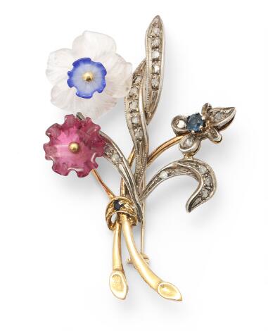 2542/1236A diamond, sapphire and rock crystal brooch of 18k gold and silver in the shape og flowers. L. 5.8 cm.