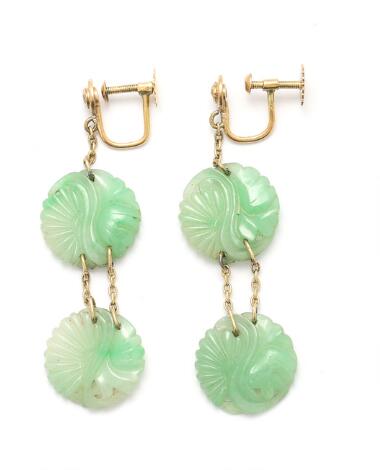 2542/1241A pair of jade ear screws each set with a rose-cut diamond and carved jade, mounted in 14k gold. L. 5 cm. (2)