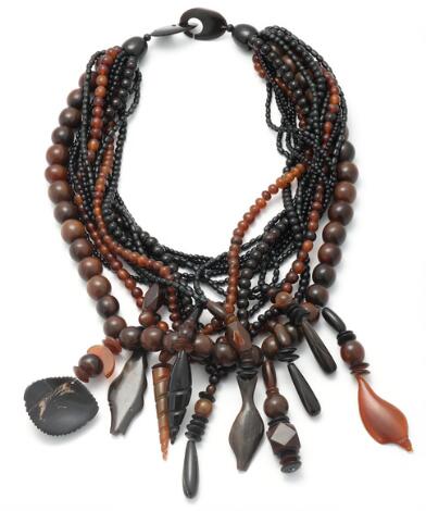 2542/1266Gerda Lynggaard: A necklace of polished horn and ivory with pendants in the shape of fish and shells. Designed for Monies. L. 60 cm.
