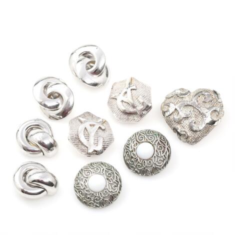 2542/1267Yves Saint Laurent, Christian Dior: Four pairs of earclips and a brooch of silver tone metal. (9)