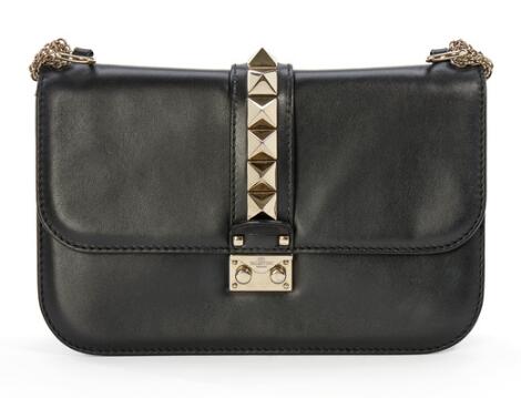 2542/1274Valentino: A "Glam Lock" bag of black leather with gold tone hardware, studs, chain strap and one compartment.