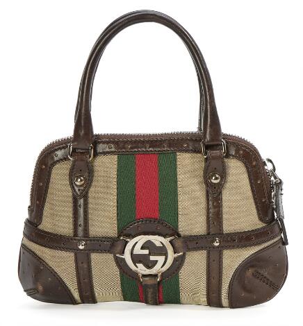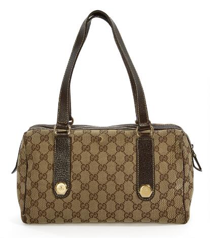 2542/1279Gucci: A bag of brown canvas and dark brown leather with silver tone hardware and two handles.