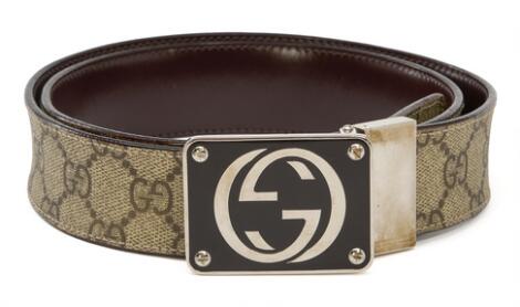 2542/1281Gucci: A belt of brown monogram coated canvas and dark brown leather and a silver toned logo buckle. Size 85.