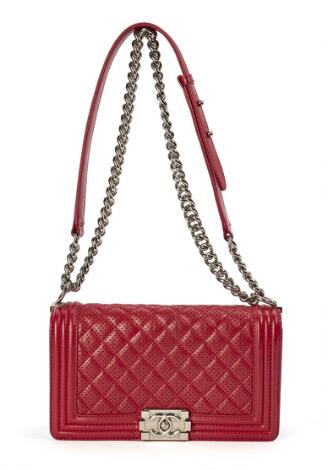 2542/1301Chanel: A "Boy" bag of red partly perforated leather with silver tone hardware and chain strap.