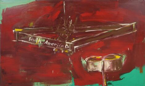 2544/529LyngbyClaus Carstensen: "Peter Bonde møder Bruce Nauman". Signed on the stretcher. Acrylic on canvas. 140 x 220 cm. Unframed.