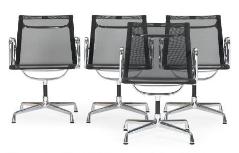 2544/503AarhusCharles Eames, Ray Eames: "Aluminium Group". Four armchairs with aluminium swivel frame. Stretched with black mesh. Manufactured by Vitra. (4)