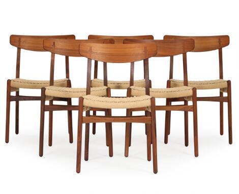2544/551AarhusHans J. Wegner: "CH 23". A set of six walnut side chairs with woven papercord in seats. Manufactured by Carl Hansen & Son. (6)