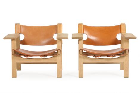 2544/509AarhusBørge Mogensen: "The Spanish Chair". A pair of solid oak armchairs, seat and back with leather. Manufactured by Fredericia Stolefabrik, 1979. (2)