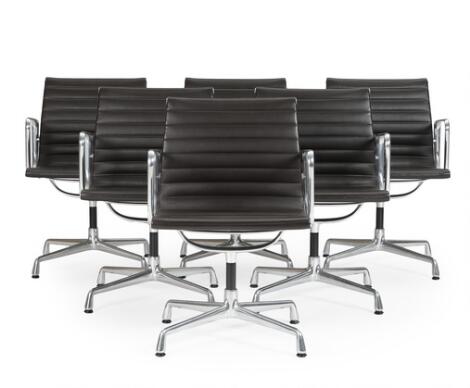 2544/524AarhusCharles Eames, Ray Eames: “Aluminium Group”. Six armchairs with chromed aluminum swiwel frame. Seat and back upholstered with dark brown leather. (6)