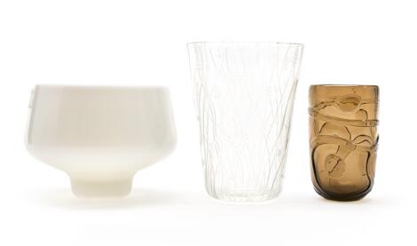 2544/552LyngbyJacob Eiler Bang: Two vases and a bowl of resp. smoke coloured glass with relief decor, clear glass with engraved decor and opal glass. (3)