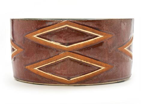 2544/501LyngbyBo Kristiansen: A cylindrical stoneware bowl. The outside with geometric relief decor. H. 14 cm. Diam. 25.5-29.5.