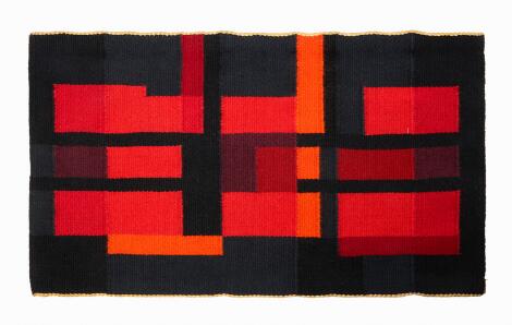 2544/546LyngbyJette Thyssen: "Hur Joh II". A hand woven wool tapestry with geometric decor in black, gery, red, orange and wine. L. 68 cm.
