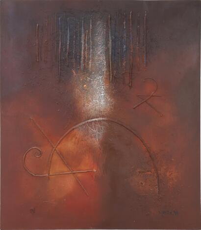 2544/541LyngbySouleymane Keïta: Untitled, 1998. Signed S. Keita 98. Oil and sewn textile on canvas. 160 x 140 cm. Uindrammet.