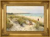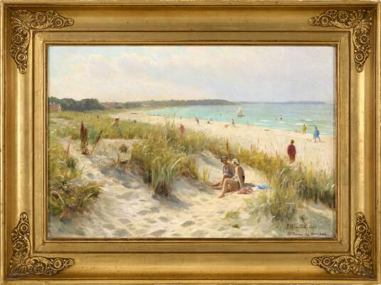 “Klitterne ved Hornbæk”. The dunes at Hornbæk. Summer day with bathers and people on the beach and in the dunes at Hornbæk. Signed and dated P. Mønsted 1935 and inscribed “Klitterne ved Hornbæk”. Oil on canvas. 31×47 cm.