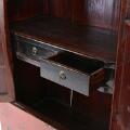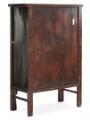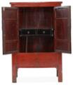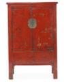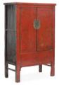 A Chinese cabinet with red lacquered and gilded paneled front with two doors, behind which are shelves and two drawers. 19/20th century. H. 160 cm. W. 100 cm. D. 48 cm.