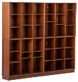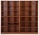 Solid teak wall unit, consisting of four bookcases. One bookcase with fastened plinth. Two loose unorginal plinths included. Manufactured by Søbørg Møbelfabrik, two bookcases are marked. H. 76 cm. W. 90 cm. D. 27,5 cm. Plinths: H. 7 cm. W. 90/180 cm. D. 23,5/24 cm. (6)