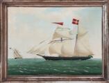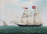 The schooner “N. M. Harboe of Skelskør” under the command of Captain J. M. Hansen 1858. Sign. H. Reimers. Oil on paper. 48×64 cm.