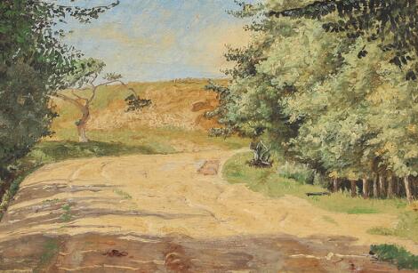 2545/9095Christen Dalsgaard: Scenery from a road with trees. Signed. Oil on canvas laid on wood. 15 x 23 cm.
