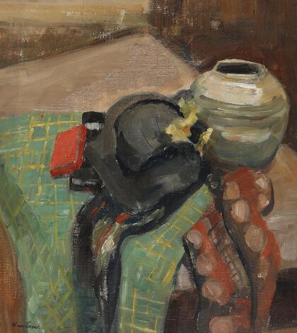 2551/94AarhusCarl Fischer: Still life with a hat and stoneware on a table. Signed Carl Fischer. Oil on canvas. 50 x 53 cm.