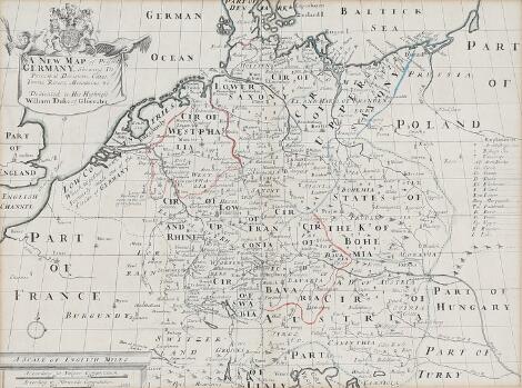 2549/8021Edward Wells: "A New Map of Present Germany". 1700. Engraving. Visible size 34.5 x 45.5 cm.