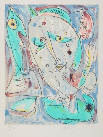 Carl-Henning Pedersen’s motifs are populated by magical creatures. Floating, winged figures, a blue colour palette and a playful and narrative imagery featuring birds, suns, horses and ships. A recurring theme in Carl-Henning Pedersen’s artistic work is the mask. We find the mask motif in his watercolours, ink drawings, paintings and even in his sculptures. For Carl-Henning Pedersen, human imagination and spontaneity are the creative force. In Herning, Pedersen created the monumental mural “Fantasiens leg om livets hjul” (The play of imagination around the wheel of life) (1966–68). One of Carl-Henning Pedersen’s most significant major works is his decoration of Ribe Cathedral from 1983. Commissioned by the Danish Arts Foundation, he decorated the cathedral with a personal interpretation of biblical motifs executed in mosaics, glass mosaics and frescoes. It is not for nothing that Carl-Henning Pedersen is often described as the “fairytale painter”.