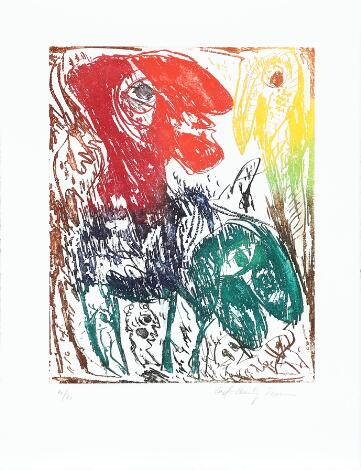 It was a stay at the International People’s College in 1933 that would prove pivotal to Carl-Henning Pedersen’s future. Here, he met Else Alfelt (1910–1974), who introduced him to painting. The couple were married the following year and, in 1936, they both debuted at the Artists’ Autumn Exhibition in Copenhagen. Seven decades of “putting colour next to colour” then followed. Carl-Henning Pedersen was interested in Picasso and Paul Klee from early on, and inspired by primitive art, chalk frescoes and children’s drawings. His art is described as spontaneous-abstract, imaginative and colourful. In 1975, during a stay in Jerusalem, he met the Norwegian artist Sidsel Ramson. They married a few years later, and the meeting with Sidsel Ramson marked a turning point in Pedersen’s art, which became freer and more glowing in colour. The couple settled in Molesmes in France.