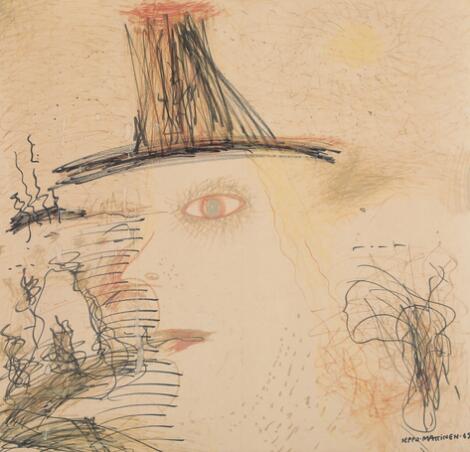 2546/664Seppo Mattinen: A man with a hat, 1969. Signed and dated. Colour marker on paper. Visible size 65.5 x 69 cm.
