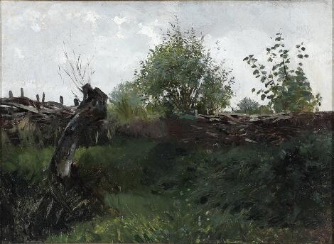 2546/167Erik Henningsen: Mark med flettede hegn. Usigneret. Olie på lærred. 35 x 48 cm.