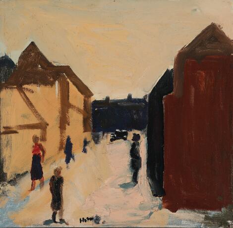 Erik Hoppe: Gadeparti. Signeret Hoppe. Olie på lærred. 60,5 x 65,5 cm.