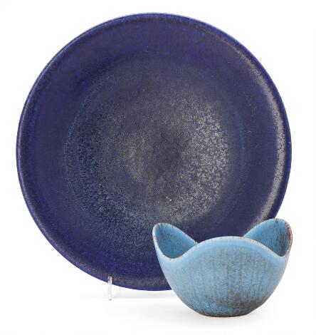 Gunnar Nylund, Saxbo: En skål og et fad af stentøj. Begge dekoreret med blå glasur. (2)