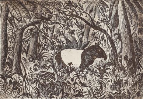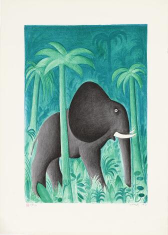 Scherfig made his début as a painter with four cubist paintings at the Artists’ Autumn Exhibition in 1928. He is best known for his lithographs and colourful primeval forest paintings in which he depicts the animals in an idyllic way that has been described as naïve by some. The painter and writer Hans Scherfig himself never saw the jungle or the savannah, but throughout his life, he dreamed of elephants, giraffes, rhinoceroses and monkeys in their natural surroundings. Artistically, he expressed himself through paintings, drawings and graphics, creating book illustrations, wall paintings, collages, advertising drawings and decoration commissions. There was a thinking and a mission behind every stroke: creatures in far distant landscapes, peasant dances in Kyrgyzstan, police brutality in Harlem and simple everyday experiences are all part of his work. The otherwise self-taught artist also engaged in cubist surface painting, linear expressionism or naïve style. His many major works include “Evas skabelse” (The Creation of Eve) (1929, the National Gallery of Denmark); “I Luxembourg Haven” (In the Luxembourg Gardens) (1931, Nordjyll. Kunstmus.); ”Urskovsbillede med næsehorn”; (Primeval Forest With Rhinoceros) (1940, same place); “Elefantkirkegård” (Elephant Cemetery) (1941, Danish Parliament); “Urskov” (Primeval Forest) (1946, Ribe Kunstmuseum); “Skaberaktapirer” (Malayan Tapirs) (1965, Bispebjerg Hospital), “Mor med tvillinger” (Mother With Twins) (gable painting, 1962, Kapelvej 27, Copenhagen) and not least “Rejse i Junglen” (Journey in the Jungle) from 1949.