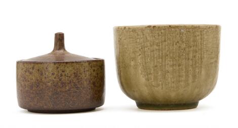 2551/1078LyngbyEva Stæhr-Nielsen, Per Linnemann-Schmidt: A stoneware four-sided bowl and lidded jar. Made by Saxbo and Palshus. H. 9.5 cm. (2)