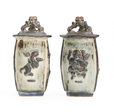 2551/1088AarhusBode Willumsen: Et par lågkrukker af stentøj. dekoreret med Sung glasur. Signeret. Royal Copenhagen. H. 19. (2)