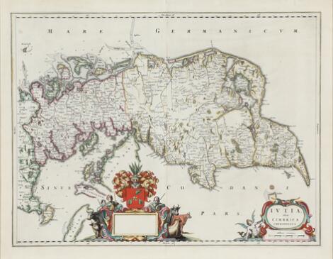 2549/8033Johan Blaeu: "Iutia Olim Cimbrica Chersoneus". 1662. Håndkoloreret kobberstik. Lysmål 48,5 x 63 cm.