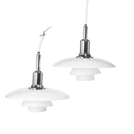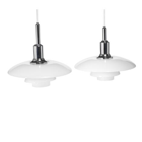 332/11LyngbyPoul Henningsen: “PH 3/2”. A pair of pendants with three layer opal glass shades, chromed socket house. Diam. 28 cm. (2)