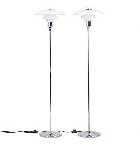 332/109LyngbyPoul Henningsen: “PH-3½/2½”. A pair floor lamps with chromed steel frame mounted with multi-layer opal glass shades. (2)