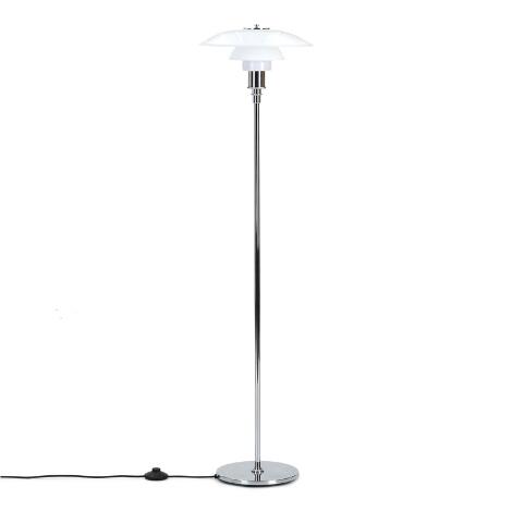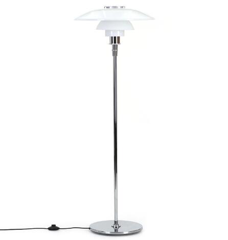 332/20LyngbyPoul Henningsen: “PH-4½/3½”. Floor lamp with chromed metal frame, multi-layer opal glass shades. H. 128 cm.