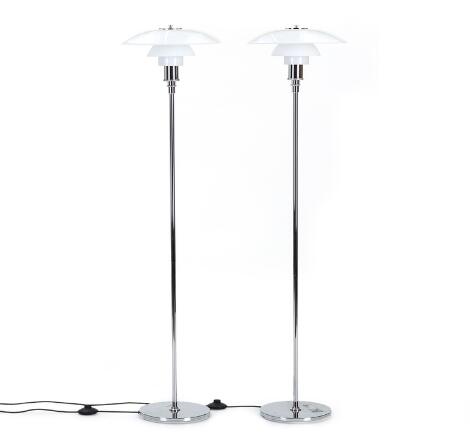 332/39LyngbyPoul Henningsen: “PH-3½/2½”. A pair floor lamps with chromed steel frame mounted with multi-layer opal glass shades. (2)