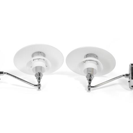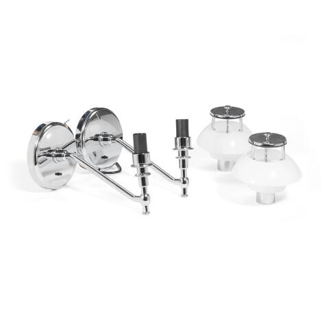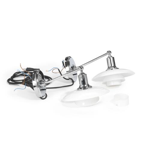332/31LyngbyPoul Henningsen: “Akademi”. A pair of chrome steel wall lamp mounted with 3/2 opal glass shades. (2)