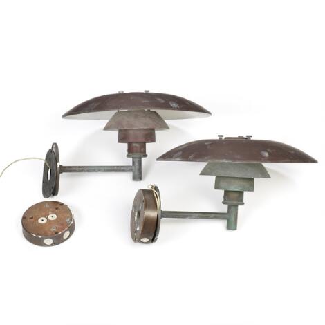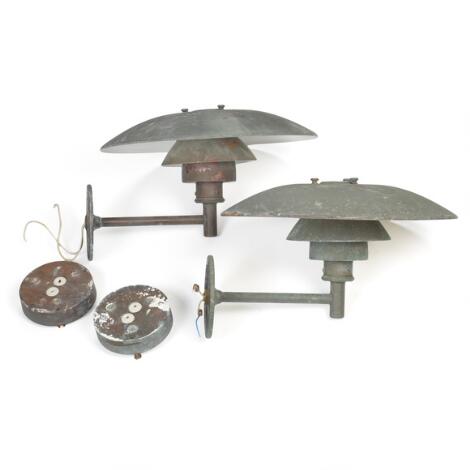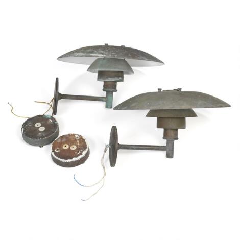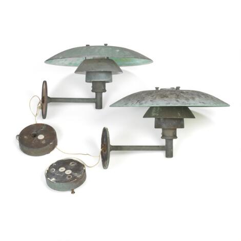 332/45LyngbyPoul Henningsen: "PH 4,5/3". A pair of patinated copper outdoor wall lamps. (2)