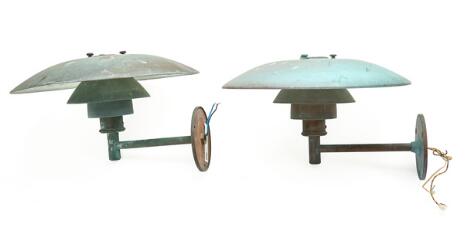 332/35LyngbyPoul Henningsen: "PH 4,5/3". A pair of patinated copper outdoor wall lamps. (2)