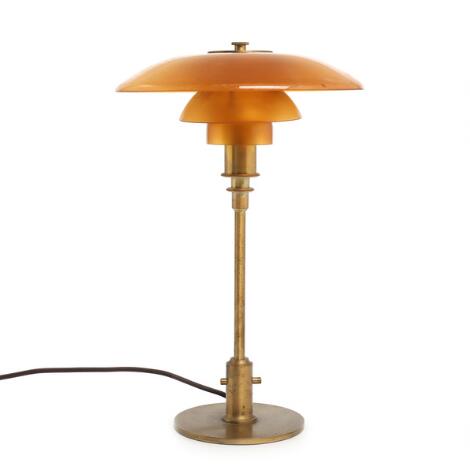 2551/660AarhusPoul Henningsen: "PH-3/2". Table lamp with frame of brass. Shades of amber coloured glass. Shades of amber coloured glass.