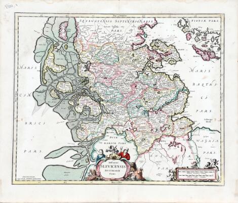 2550/171Jan Janssonius: "Ducatus Slevicensis Australis Pars". 1666. Håndkoloreret kobberstik. Bladstørrelse 52 x 61 cm. Uindrammet.