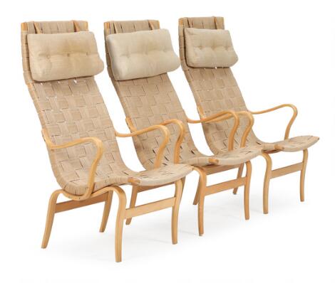 2549/846Bruno Mathsson: "Eva". Tre lænestole med stel af bøg, udspændt med hørgjorde. Karl Mathsson, 1972. (3)